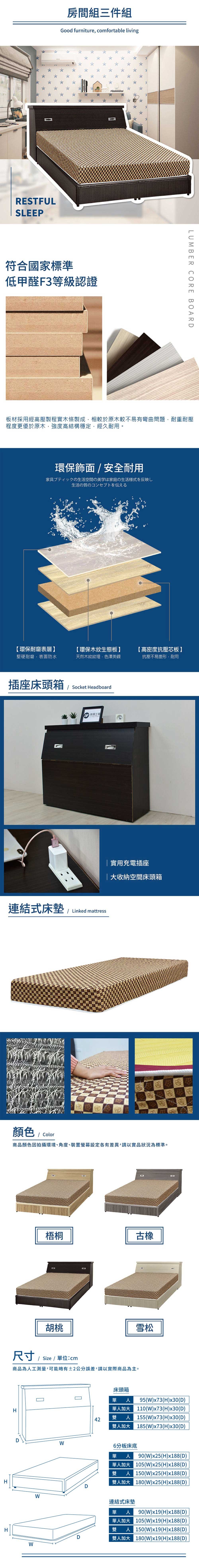 傢俱工場-簡約風 插座房間三件組(床頭+六分床底+床墊)-單大3.5尺梧桐