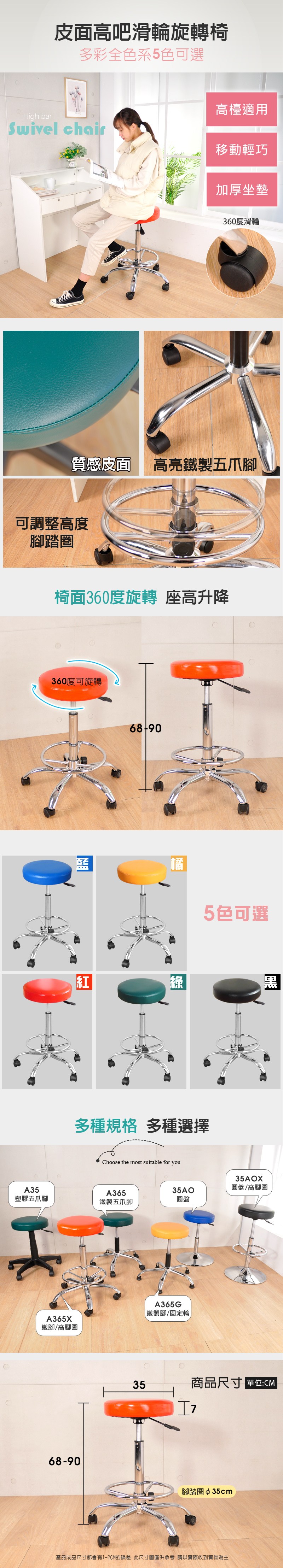 ◆較高68-90CM高低調整,適合較高的吧台工作, 銀色電鍍鐵五爪腳座和腳踏圈加PP輪,椅面可360旋轉