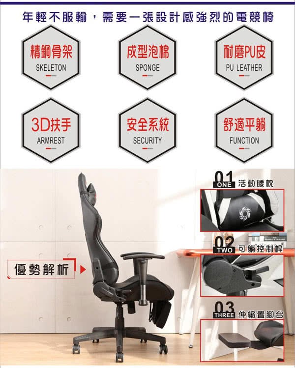 ★全椅柔軟PU皮革+泡棉組成,酷黑立體剪裁,帥氣有型整體質感更加提昇,具有層次的時尚質感