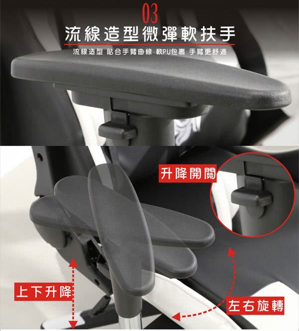 ★可升降的扶手搭配可轉動PU軟墊,讓您有良好支撐觸感和不同高度需求