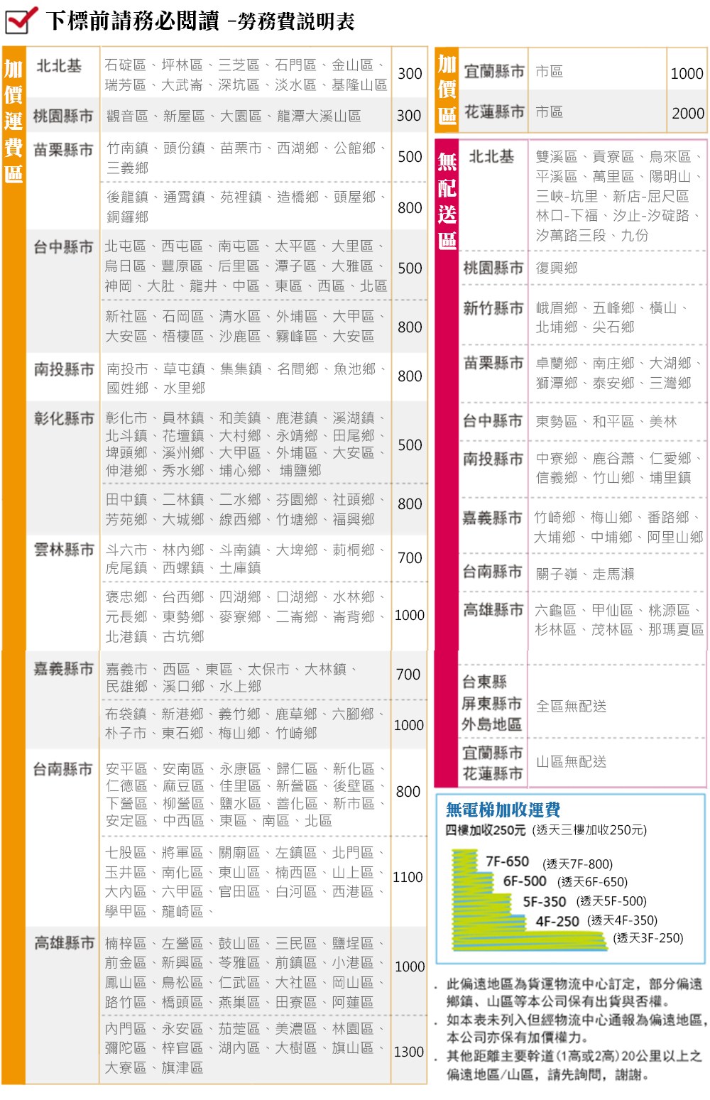 5.電梯大樓,以電梯載運,若需走樓梯搬運情形下:1F-3F免收樓層費,四樓加收250(5F加收350元.6F加收500,透天三樓以四樓計算)。