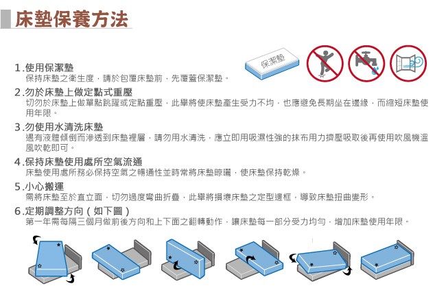 請勿在床墊上站立、跳躍或是長期坐在床墊邊緣,以免單點受力過大使得彈簧受損造成內部結構變形。