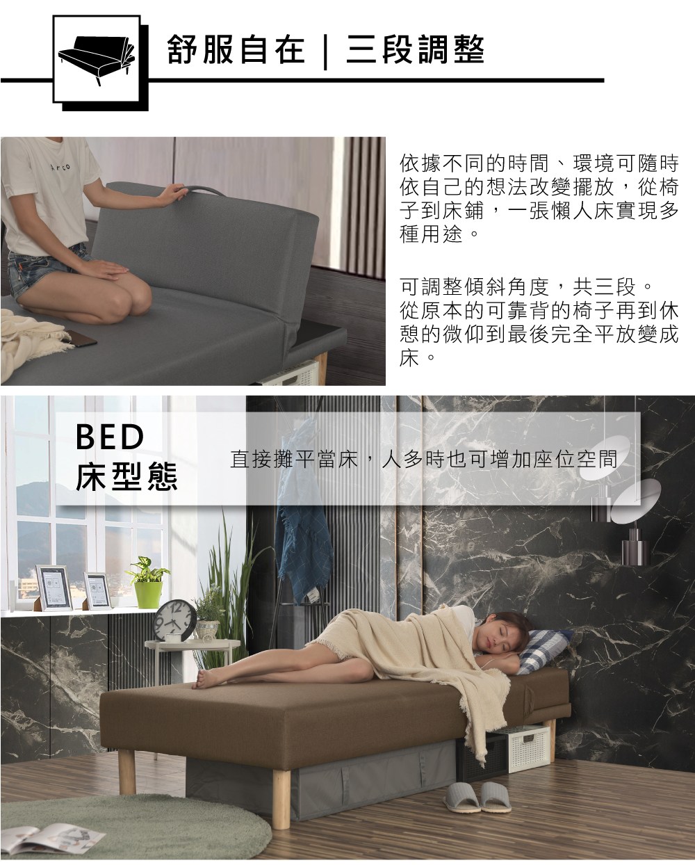 【UHO】勞拉-抗菌機能布三段式懶人床(硬型) 3尺單人咖啡色