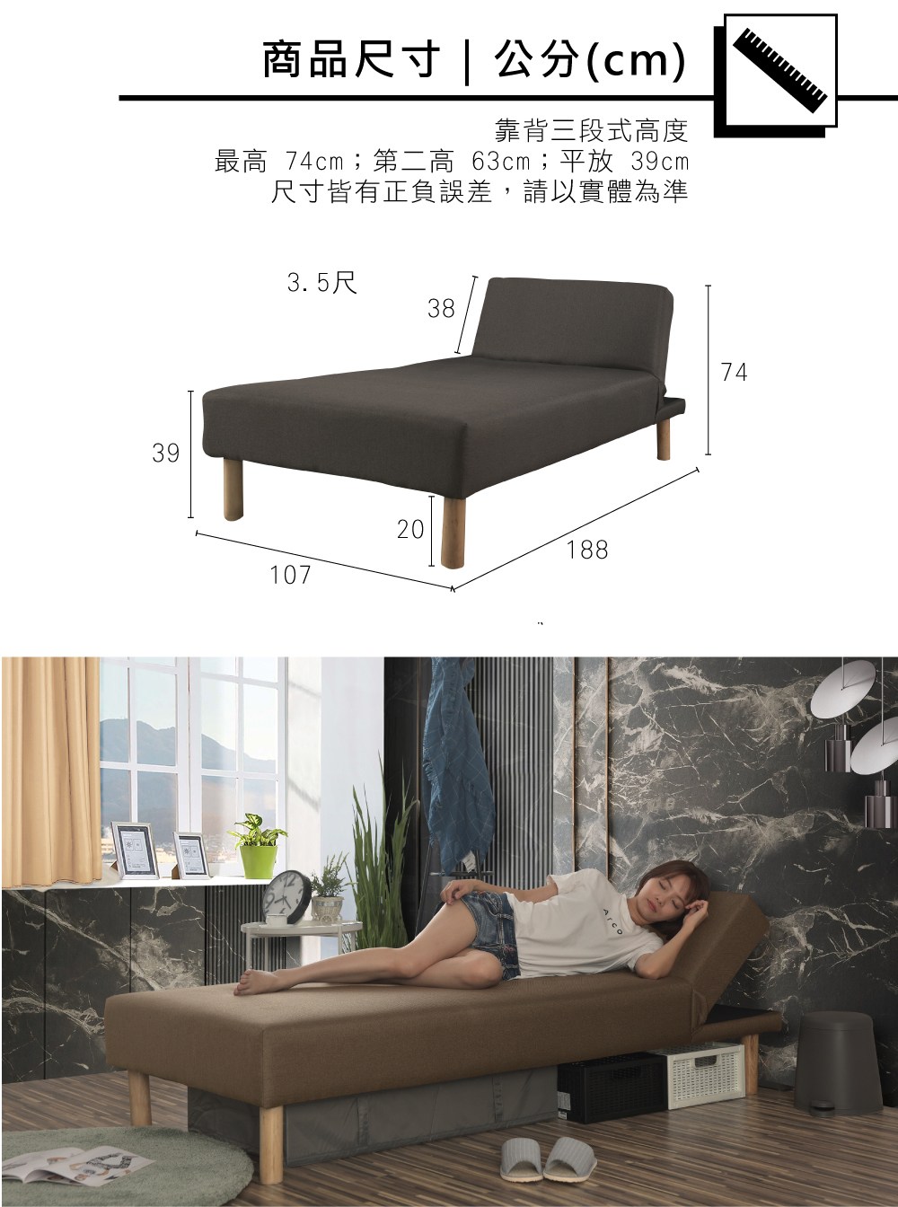 【UHO】勞拉-抗菌機能布三段式懶人床(硬型) 3尺單人咖啡色