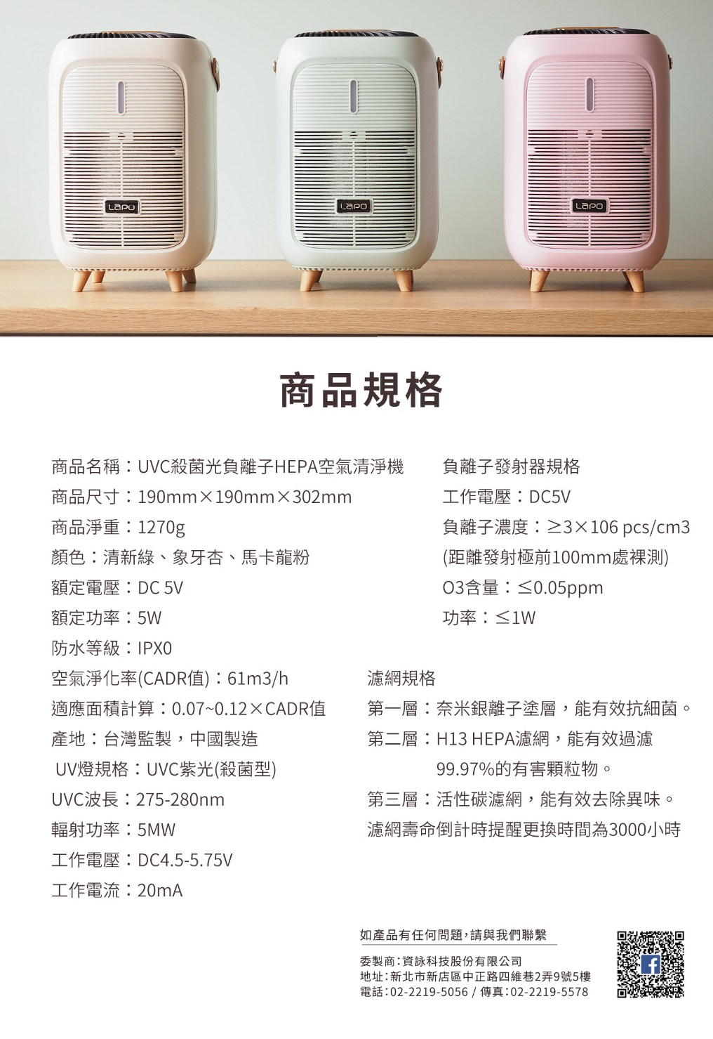 LAPO UVC 殺菌光負離子 HEPA 空氣清淨機 適用3-6坪馬卡龍粉