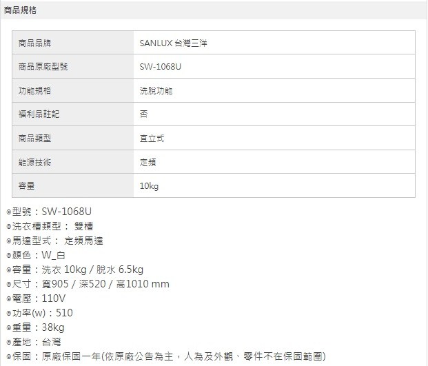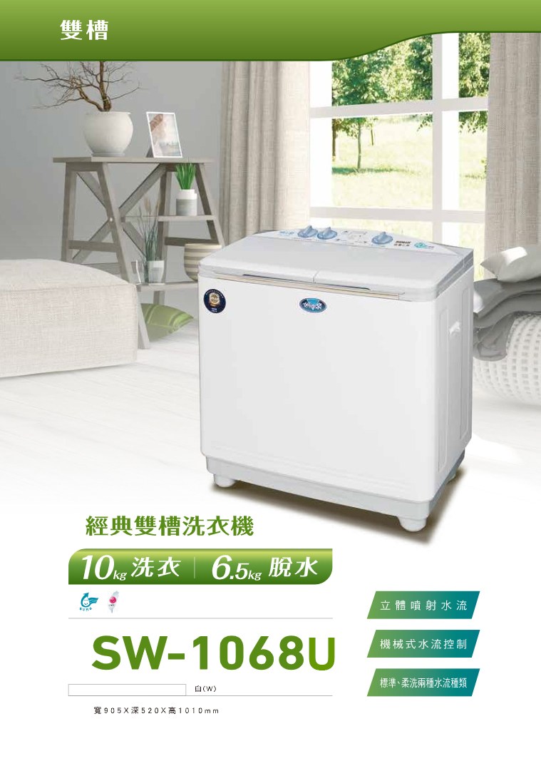台灣三洋 媽媽樂10公斤雙槽洗衣機SW-1068U~含基本安裝
