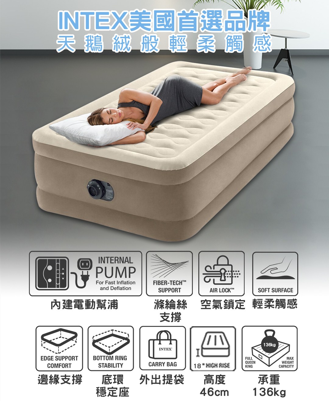 INTEX超厚絨豪華內建幫浦雙人加大充氣床-寬152cm(64427)