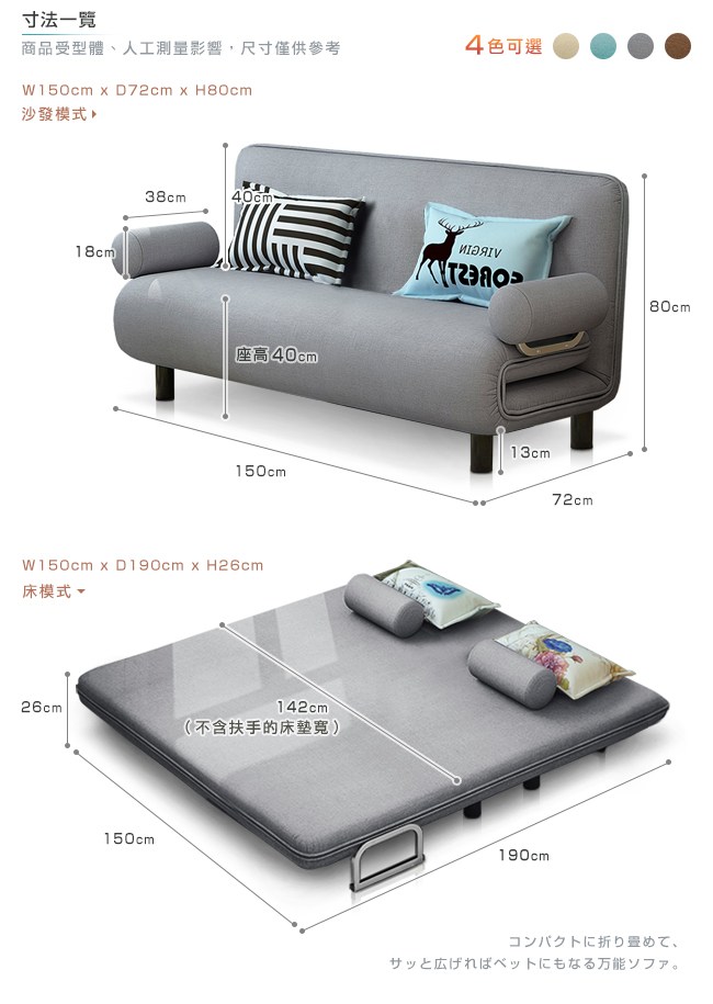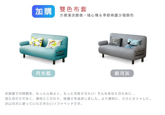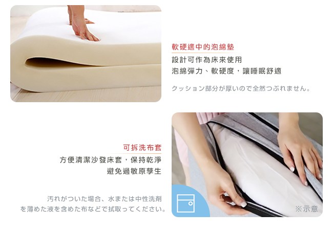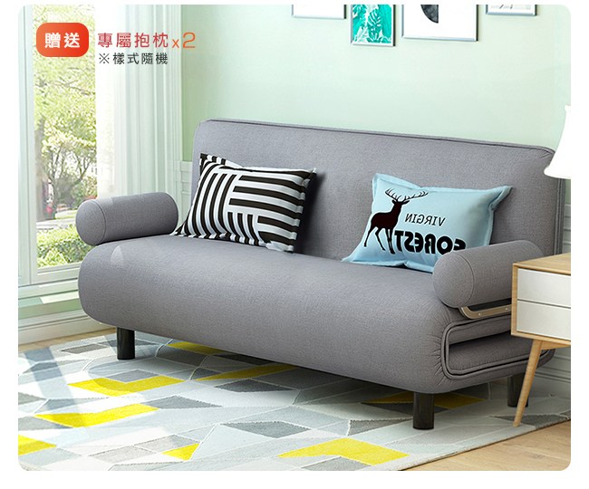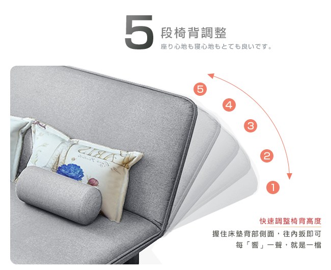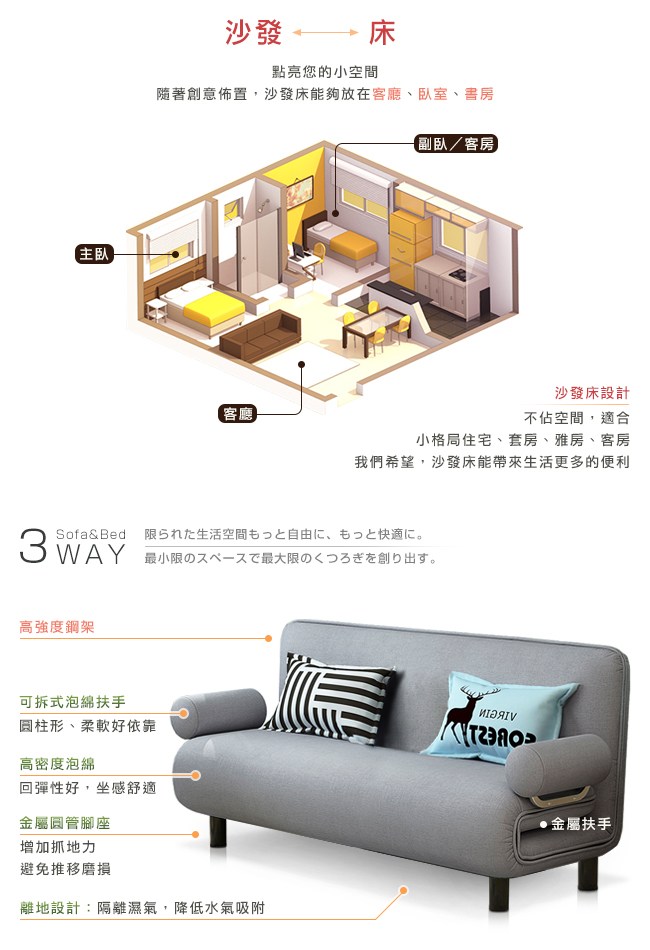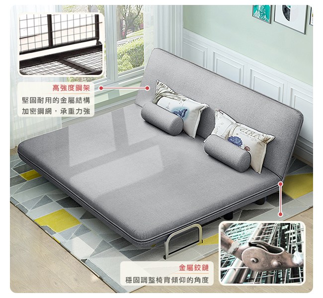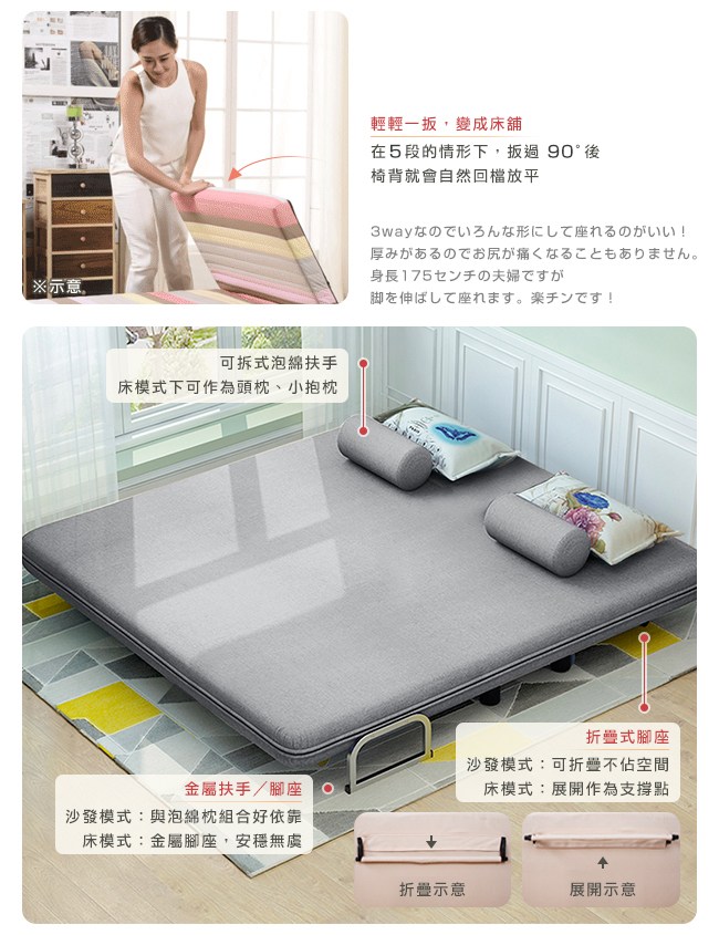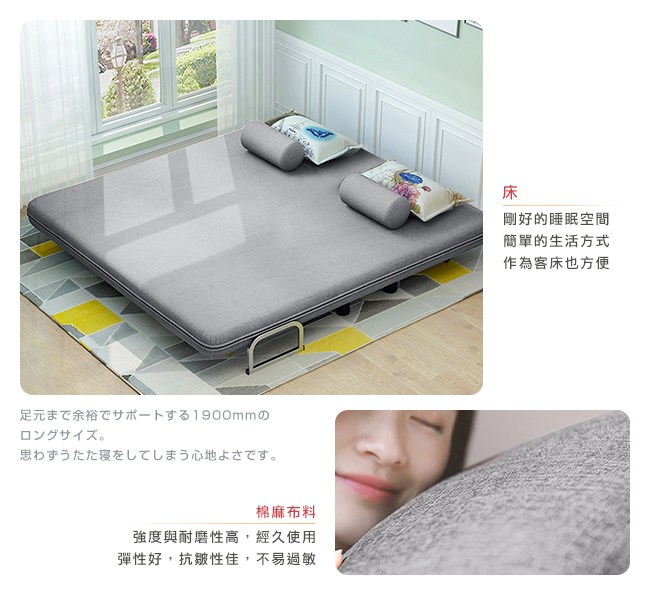 棉麻布料,強度與耐磨性高,經久使用。抗皺性佳,不易過敏。高密度泡棉,回彈性好,坐感舒適。可拆式泡棉扶手,圓柱型、柔軟好依靠,也能作為頭枕、小抱枕。金屬扶手結構堅固,床模式下則作為腳座,床舖安穩無虞。五段椅背快速調整,握住床墊背部側面,往內扳即可選擇椅背傾仰度。椅背扳過90度後,自然回檔放平,簡單變成一張床舖。高強度鋼架,堅固耐用的金屬結構,與加密鋼網,承重力強。金屬鉸鏈,穩固調整椅背的傾仰角度。金屬圓管腳座,增加抓地力,避免推移磨損。椅背後面的折疊式腳座:「沙發模式」可折疊不佔空間。「床模式」展開作為支撐點。離地設計,隔離濕氣,降低水氣吸附。可拆洗布套,方便清潔沙發床套,保持乾淨,避免過敏原孳生。