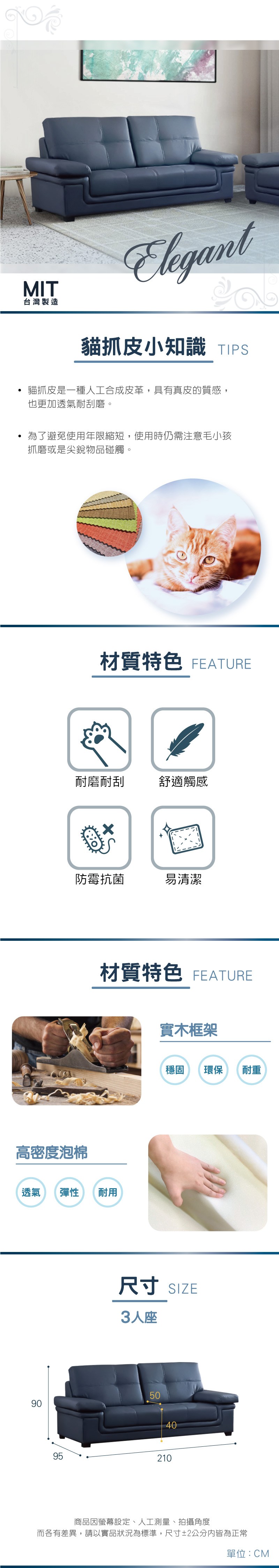 時尚屋 台灣製艾斯三人座耐磨貓抓皮沙發 免運免組(共20色)