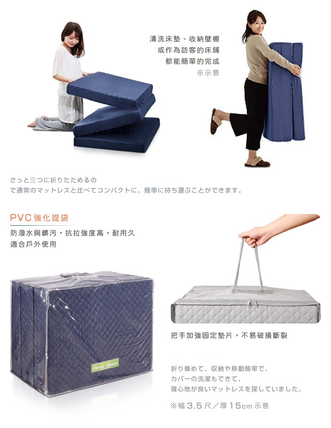 台灣製造,日本同步販售,品質安心。三折設計,展開、折疊床墊,快速、簡單佈置完成。床墊厚度11cm,薄型設計,省空間好收納。對於家裡的臥房、客房、兒童房來說,展開就是一張床,折疊起來就是一個座墊。POLYESTER棉,透氣性佳,好睡舒適,質輕耐磨,經久使用。依據CNS 7447國家標準,72B鋼線獨立筒,具備韌性佳、結構強、耐用久,用於獨立筒床墊是最舒適的硬度。獨立的彈簧,分散體壓,各別配合身形而下沉,保持自然的睡姿,減輕骨骼的壓力。可拆洗床套,定期清潔,可避免塵蟎、細菌或過敏原孳生,保持居家衛生。
