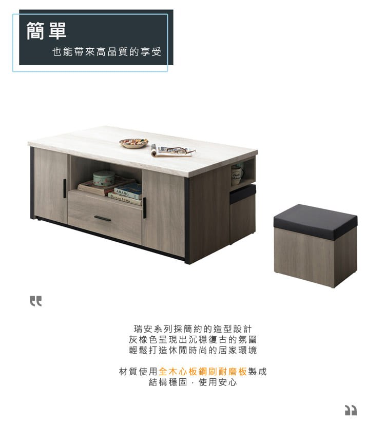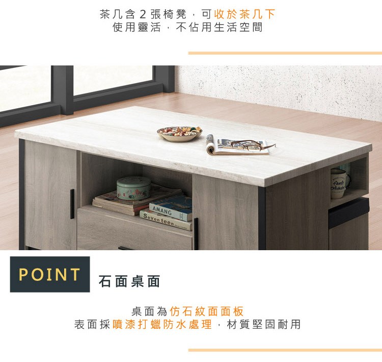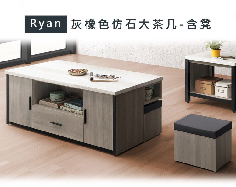 【Hampton 漢汀堡】瑞安灰橡色仿石大茶几-含凳