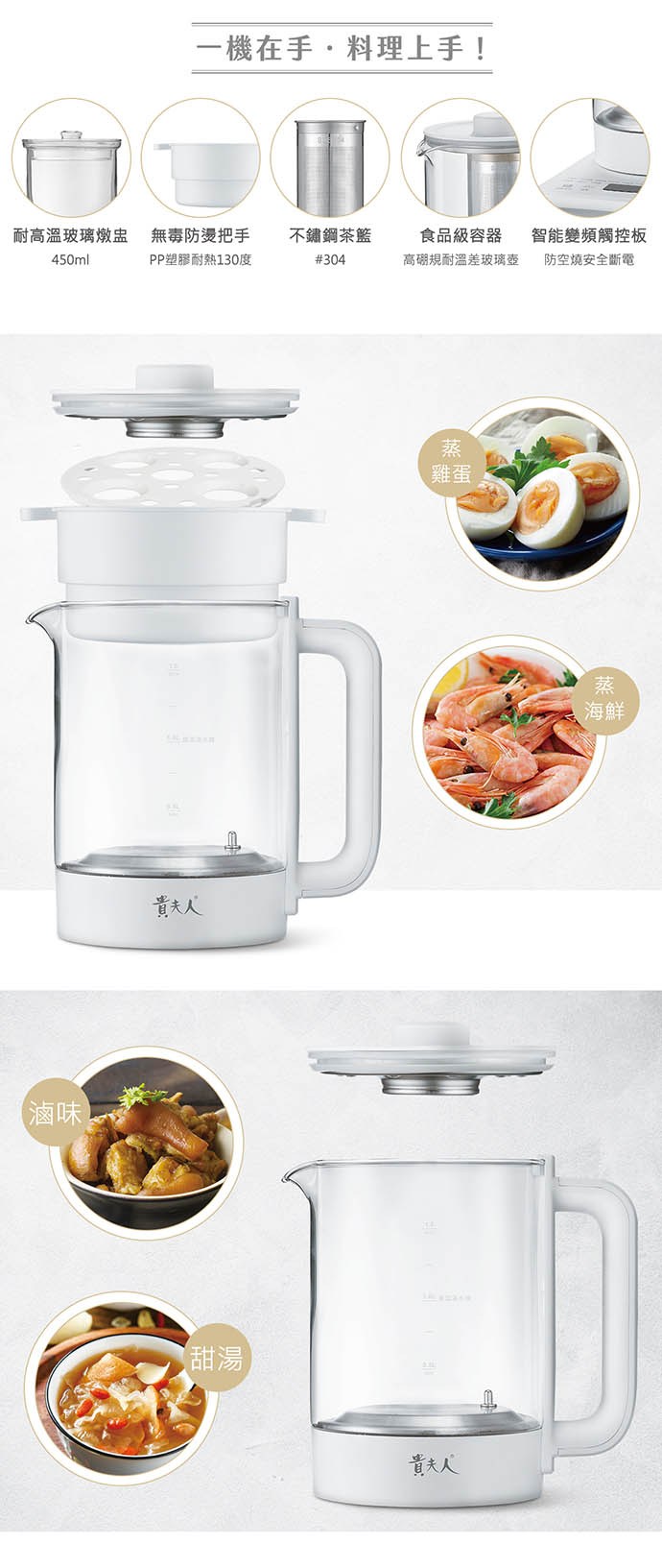1.1.5公升大容量,另附玻璃燉盅及不鏽鋼過濾器、蒸蛋架,可煮、燉、蒸、滷、泡茶多功能使用。