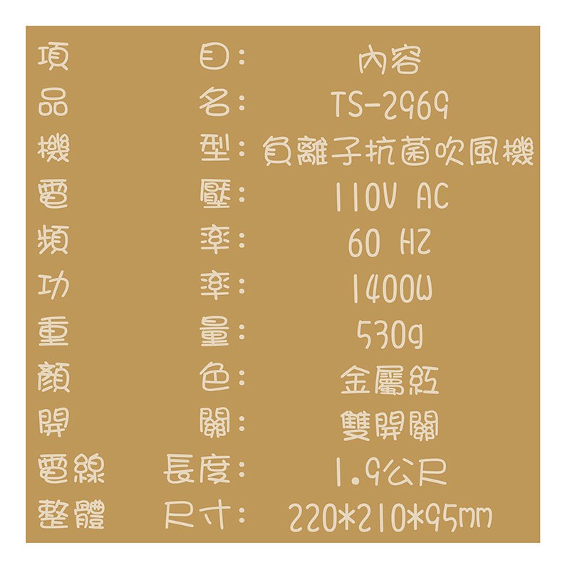 達新牌 銀離子抗菌負離子吹風機 TS-2969