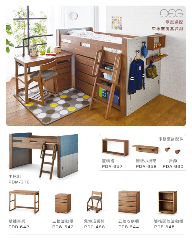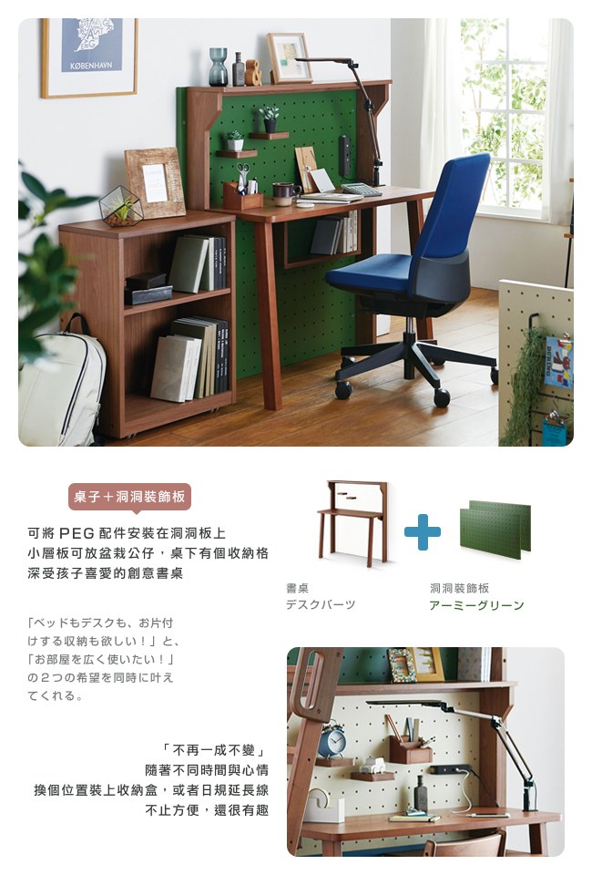 依孩子的喜好,豐富空間的色彩,佈置一個充滿樂趣的房間吧。與 PEG 書桌結合使用,可將專屬配件安裝在洞洞板上,小層板可放盆栽、公仔,桌下有個壁掛式收納格。風格不再一成不變,隨著不同時間與心情,換個位置裝上收納盒,或者日規延長線,不止方便,還很有趣,深受孩子喜愛的創意書桌。