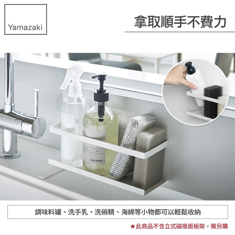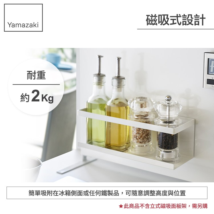 磁吸式設計,簡單吸附在冰箱側面或任何鐵製品,讓您隨意調整高度與位置,調味料罐、洗手乳、洗碗精、海綿等小物都可以輕鬆收納。