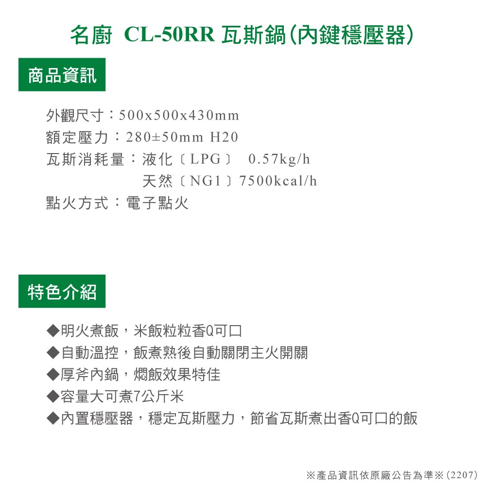 名廚瓦斯鍋(內鍵穩壓器)CL-50RR_桶裝【全省配送】