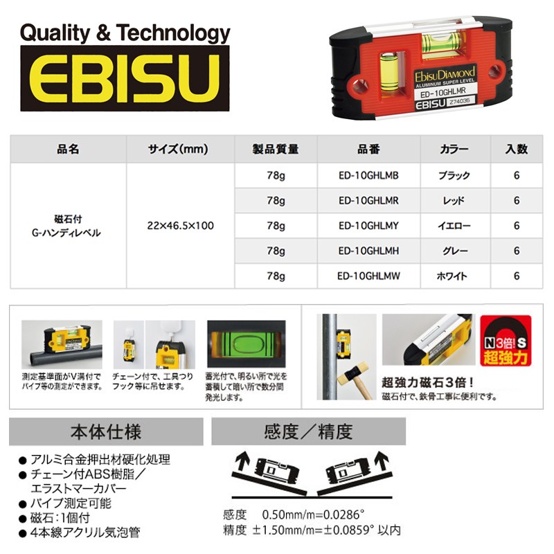 Ebisu DiAMOND Pro-Mini系列 雙掛勾 強磁性 LED水平尺 3泡式 1個