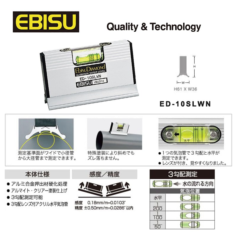 【日本EBISU】排水流向水平尺 100mm (無磁-圓弧底座)