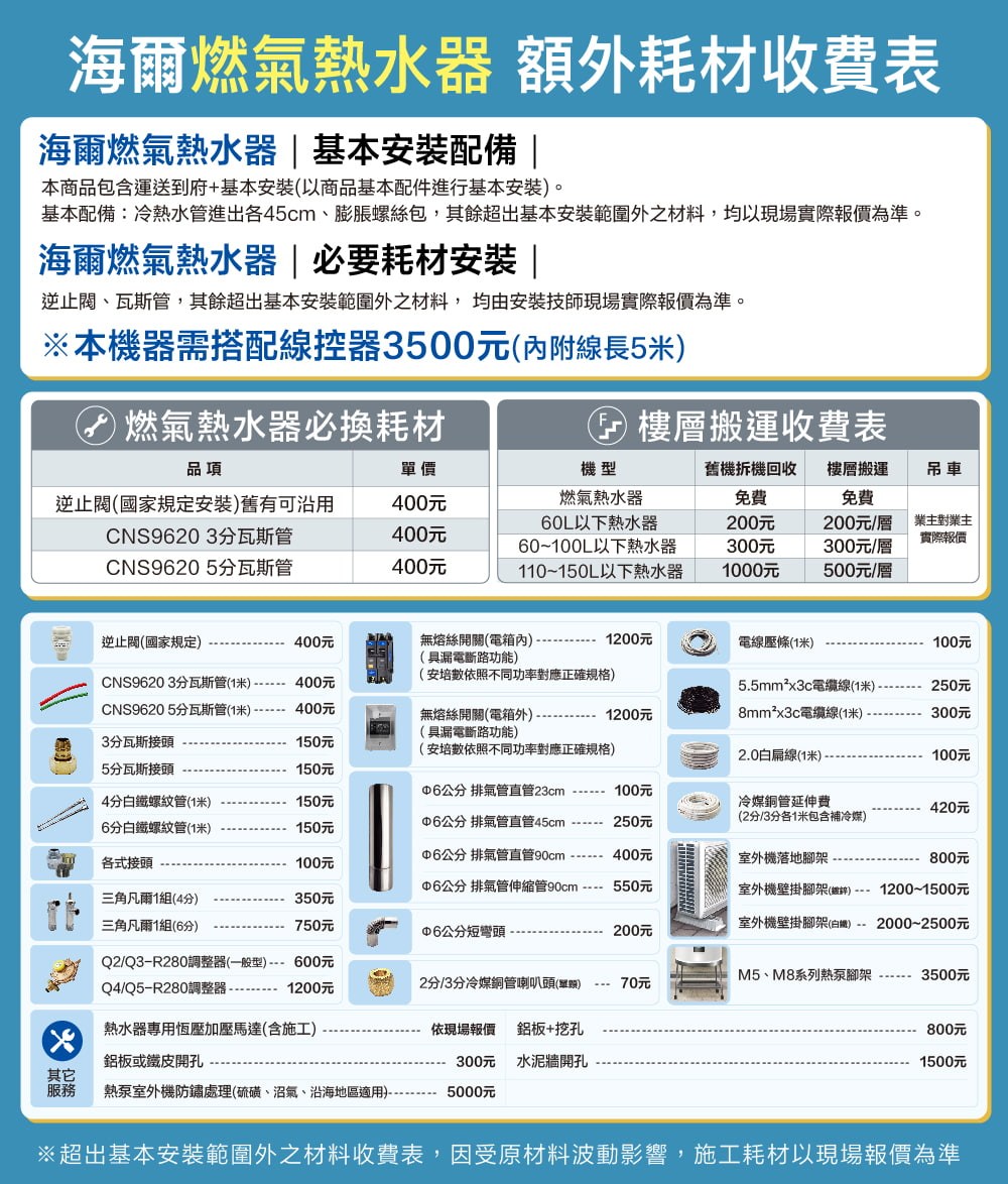 →基本安裝零件不包含額外耗材,實際耗材費用與服務費由安裝技師現場報價。
