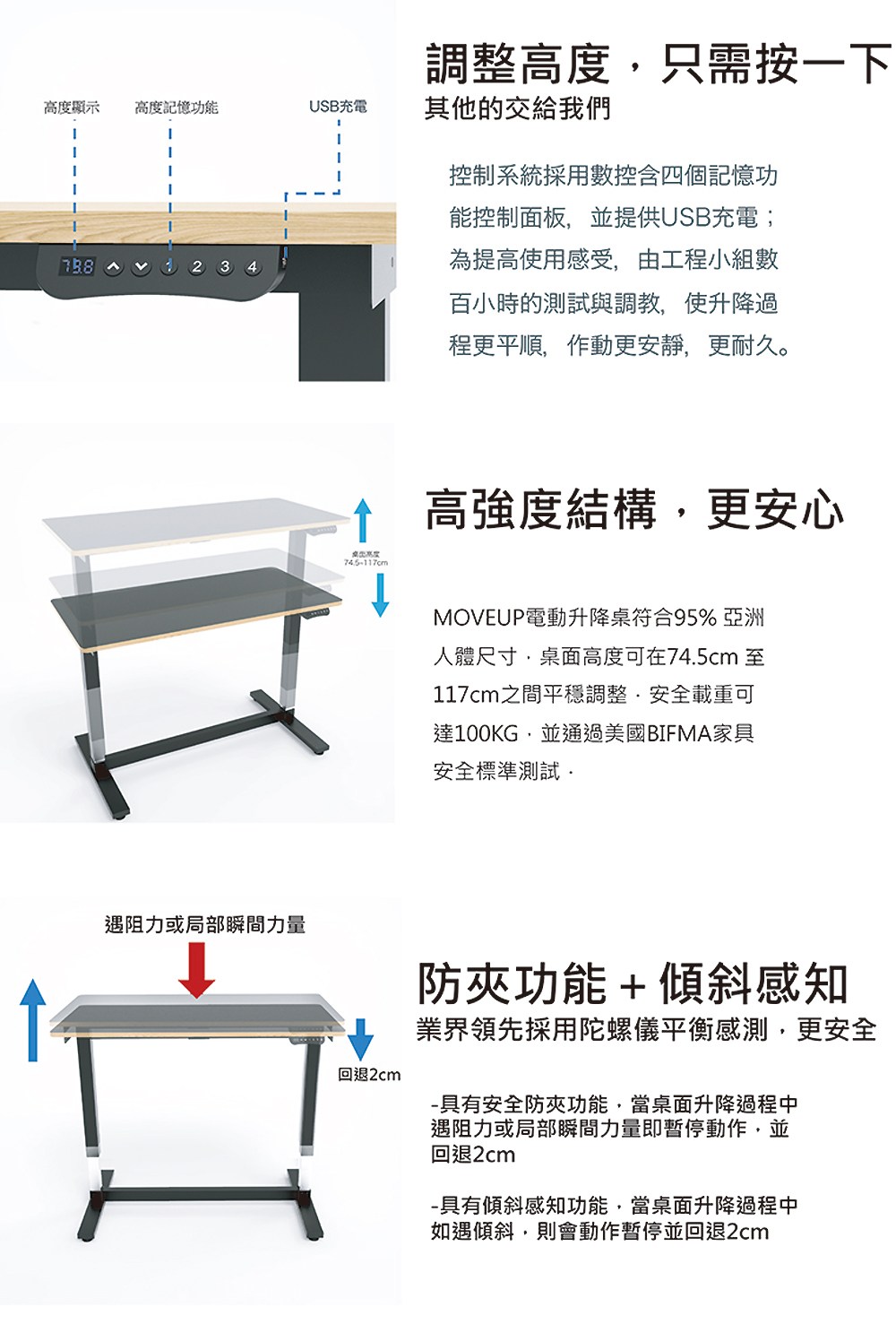MOVEUP 電動升降桌設計採現代主義 “form follow function” 的理念,線條簡潔,讓工作空間更有型;依照人體工學絕大多數人身體尺度,桌面升降範圍為74.5-117cm,不論在各種高度都能保有安定感。