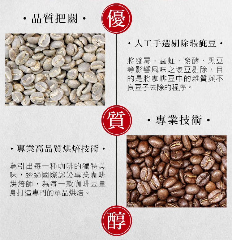 ◆經由人工挑選優質生豆,剔除瑕疵生豆(發霉或發酸生豆蟲蛀破碎生長不全)