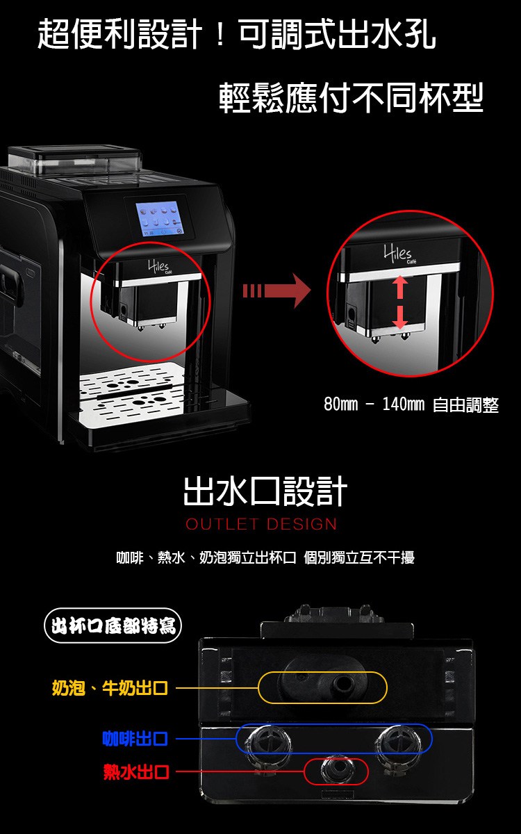 ◆可調式出水孔,應付不同高度杯子