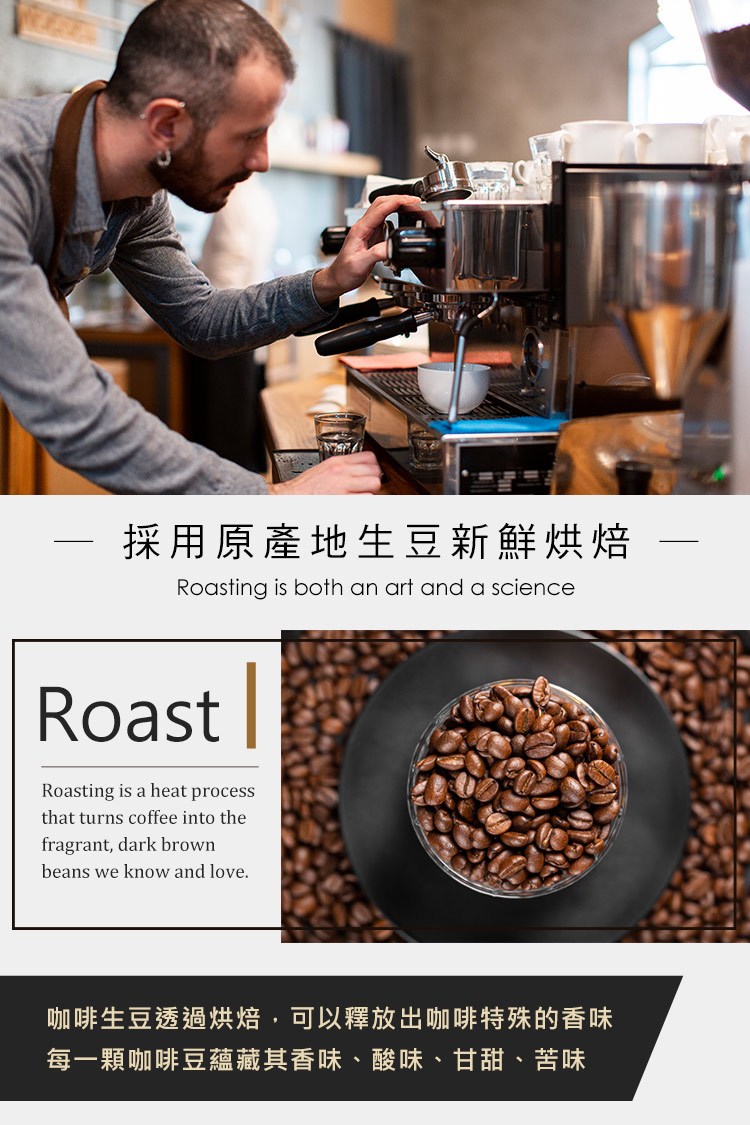 ※本款咖啡屬於重深烘,因烘焙程度很深,咖啡豆表面出油屬於正常現象。