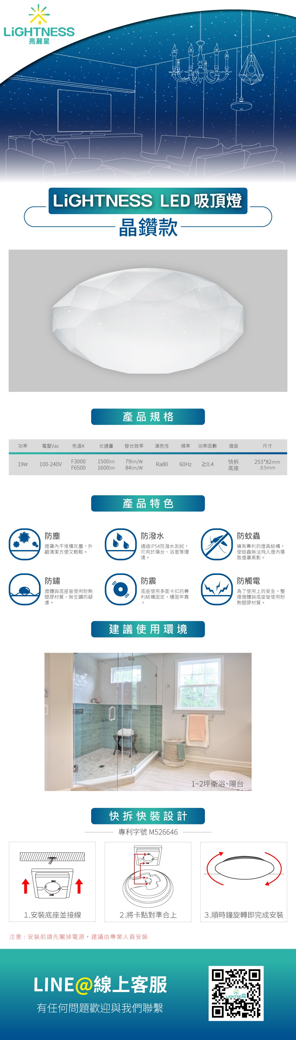 LiGHTNESS LED吸頂燈 晶鑽 19W 白光 IP54