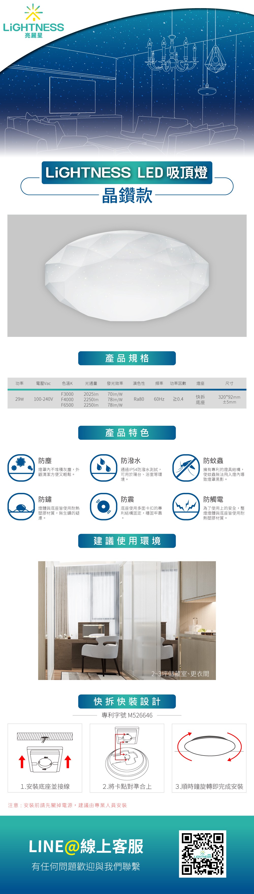 LiGHTNESS LED吸頂燈 晶鑽 29W 黃光 IP54