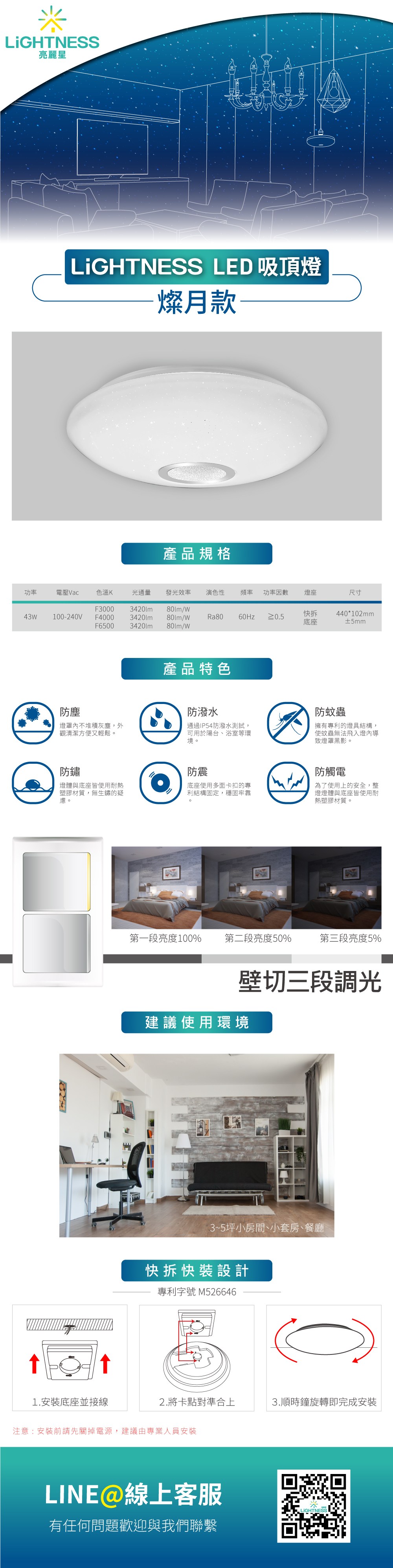 LiGHTNESS LED吸頂燈 燦月 43W 黃光 壁切三段亮度
