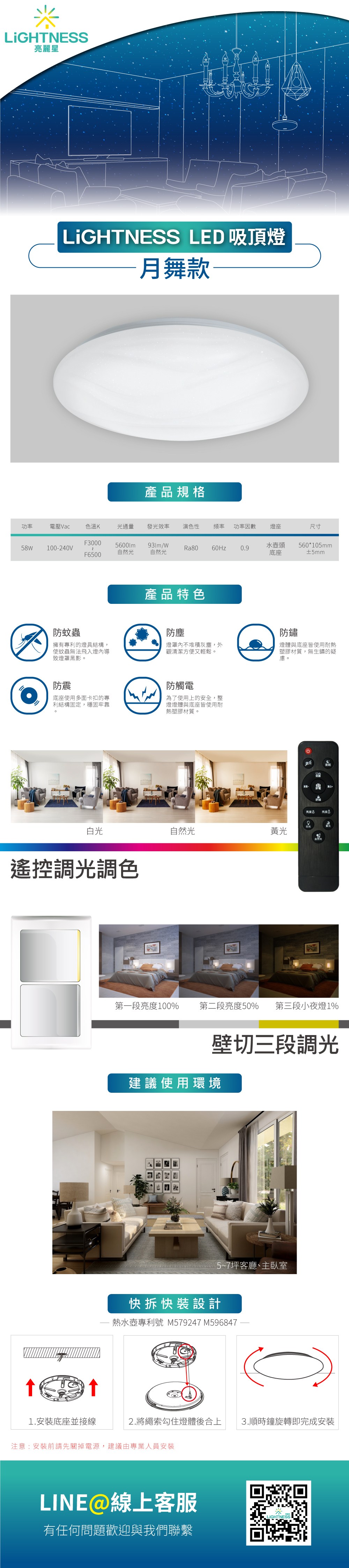 LiGHTNESS LED吸頂燈 月舞 58W 遙控調光調色+壁切三段亮度