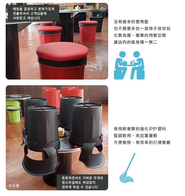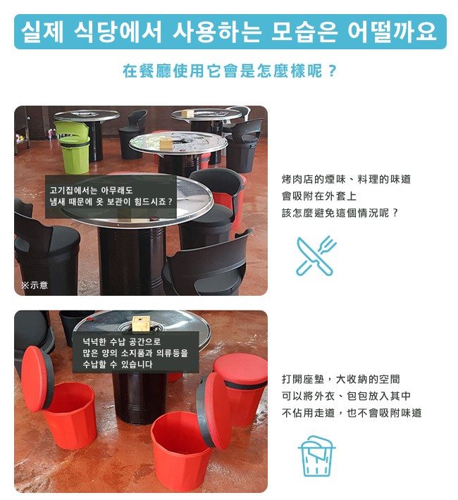 在餐廳作為餐椅時,它使用耐衝擊的強化 PP 塑料製成,堅固耐用。打開就是專屬個人的收納桶,客人的外衣、隨身物品可放入其中,安全又便利。大小適中,不會佔用走道,並且省下了置物籃的空間,化繁為簡,簡單的用餐環境,讓店內的風格獨一無二。由於重量輕方便搬移,能有效率的打掃餐廳,省時又省力。