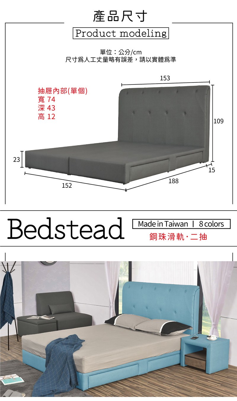 IHouse-貝殼波堤 雙人5尺(貓抓皮床頭片+收納抽屜底)-房間兩件組/床組煙霧灰#627-22