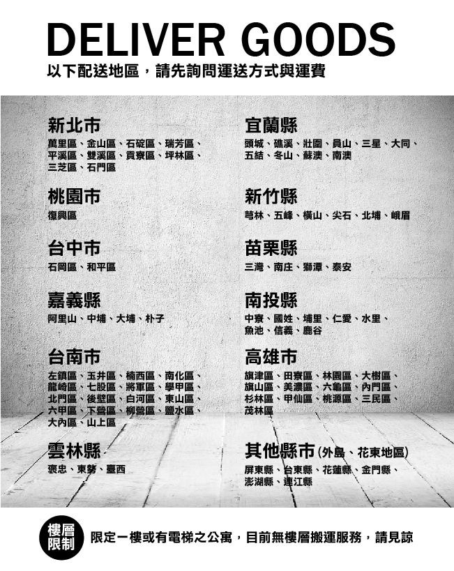 ●配送範圍:台灣本島,台東、花蓮和外島恕不在配送範圍。實際若因特殊地型限制(山區、鄉、鎮、村)、樓梯太小、無法搬運上樓等因素,導致無法配送,配送廠商保有出貨的權利。