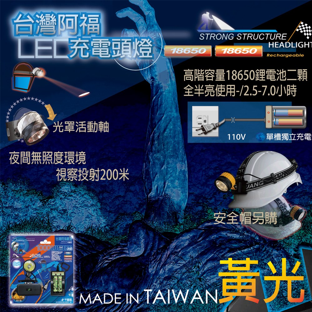 商品內容物:台灣阿福塔塔加黃強光織帶頭燈組H24(含電池充電器)