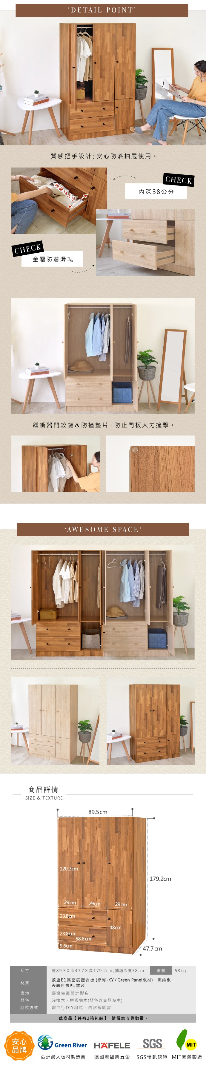HOPMA》美背復古三門二抽二格衣櫃 台灣製造 衣櫥 抽屜櫃 衣物收納櫃-拼版柚木