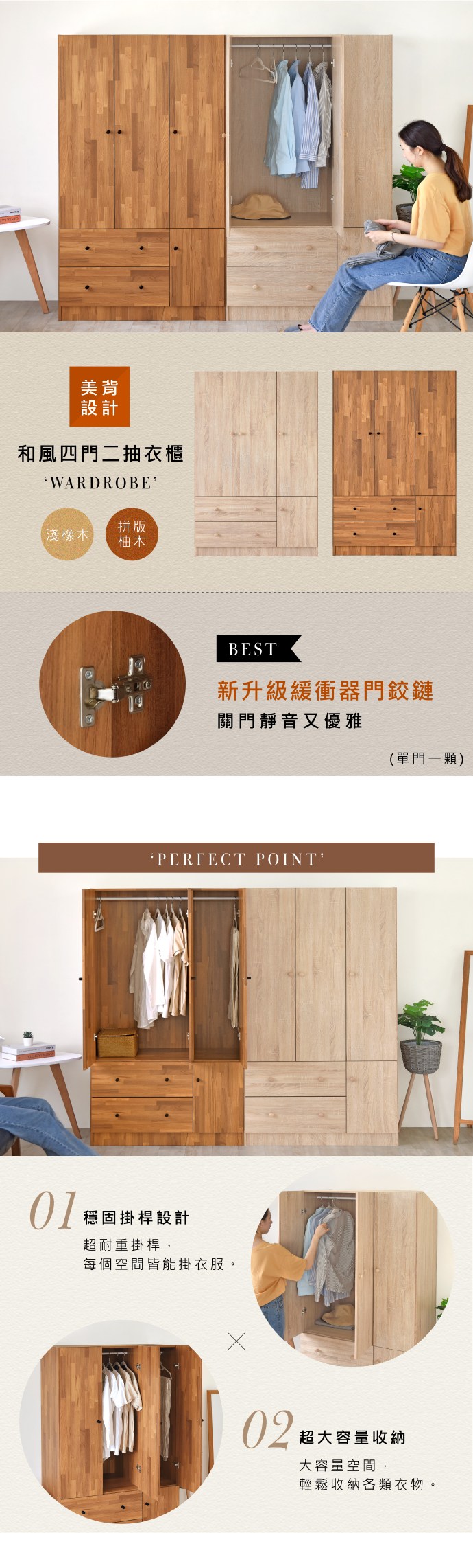 《HOPMA》美背和風四門二抽衣櫃 台灣製造 衣櫥 抽屜櫃 衣物收納櫃-拼版柚木