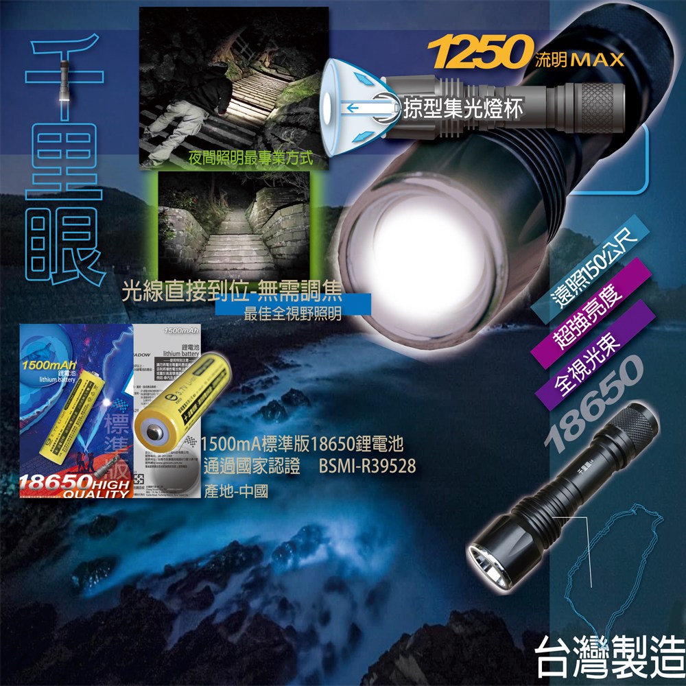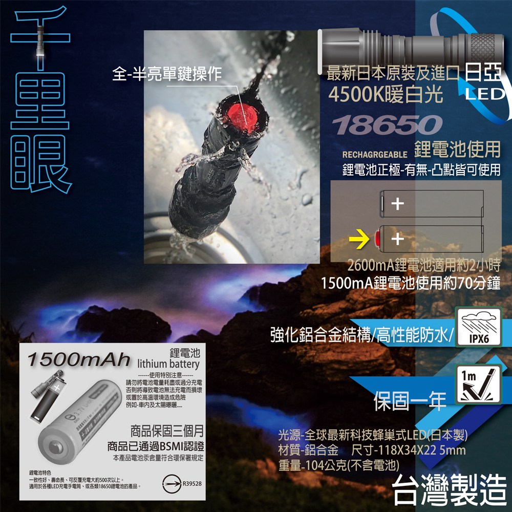 商品內容物:千里眼黃光手電筒複合特仕版全視定焦L4B(含1500mAh*1)
