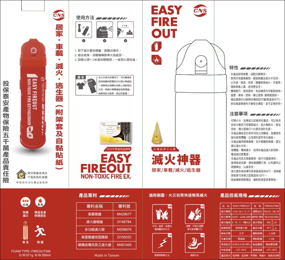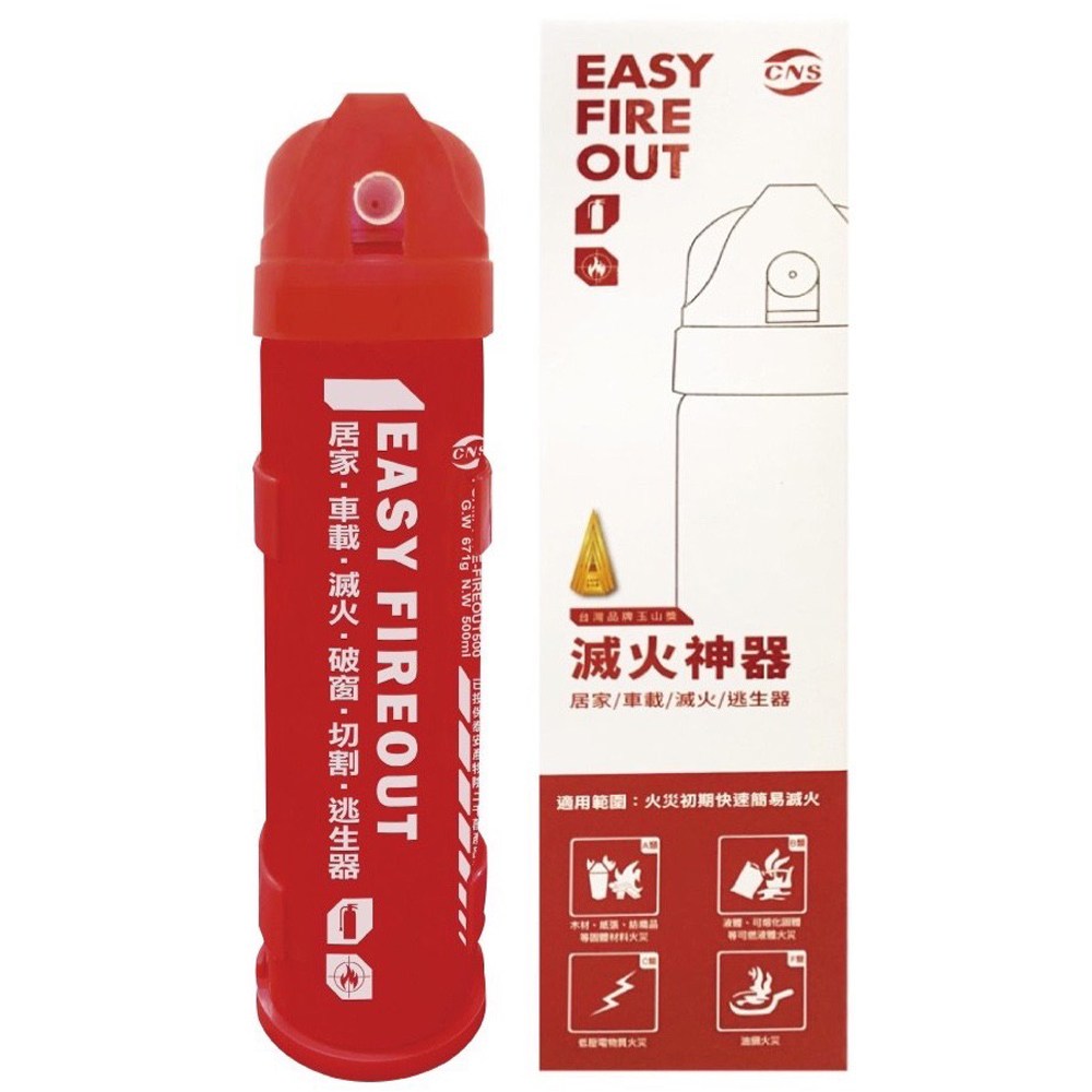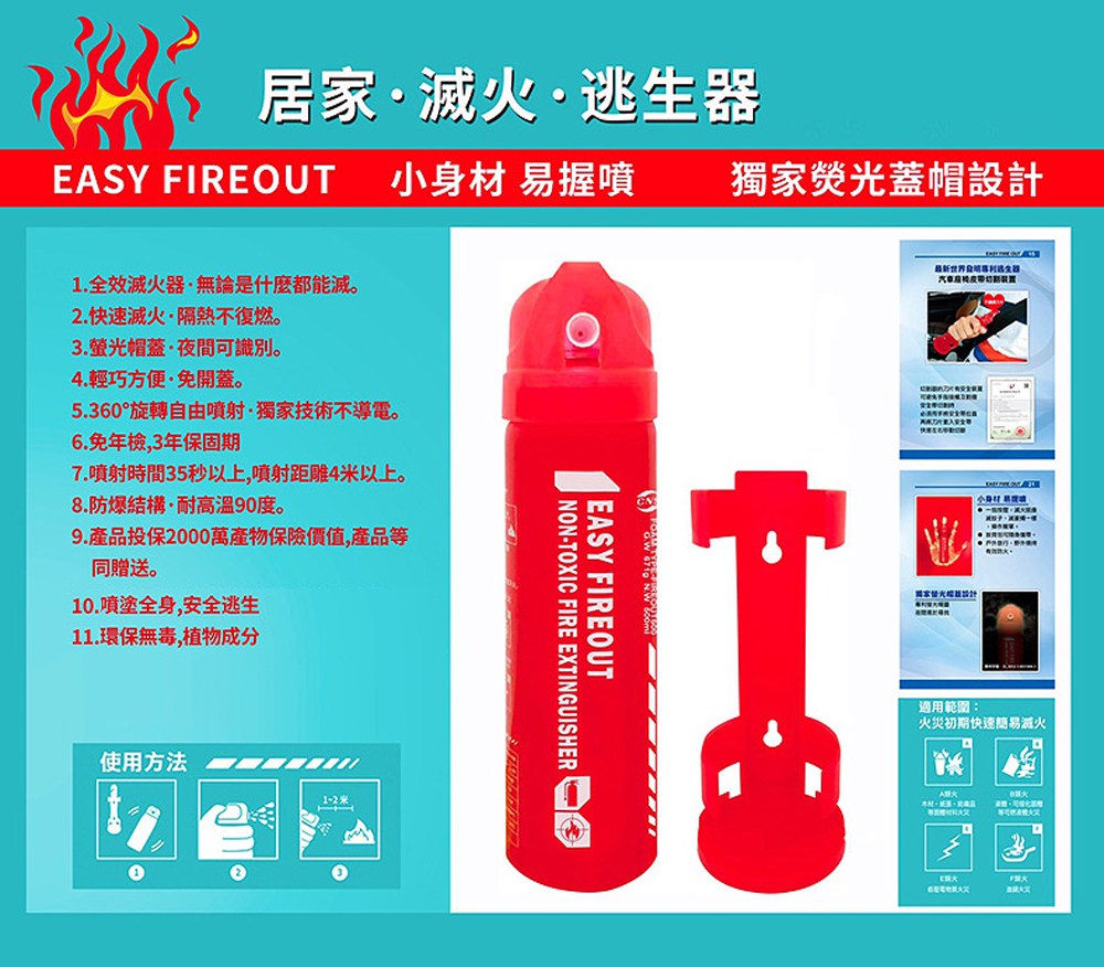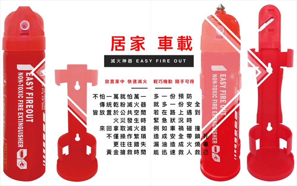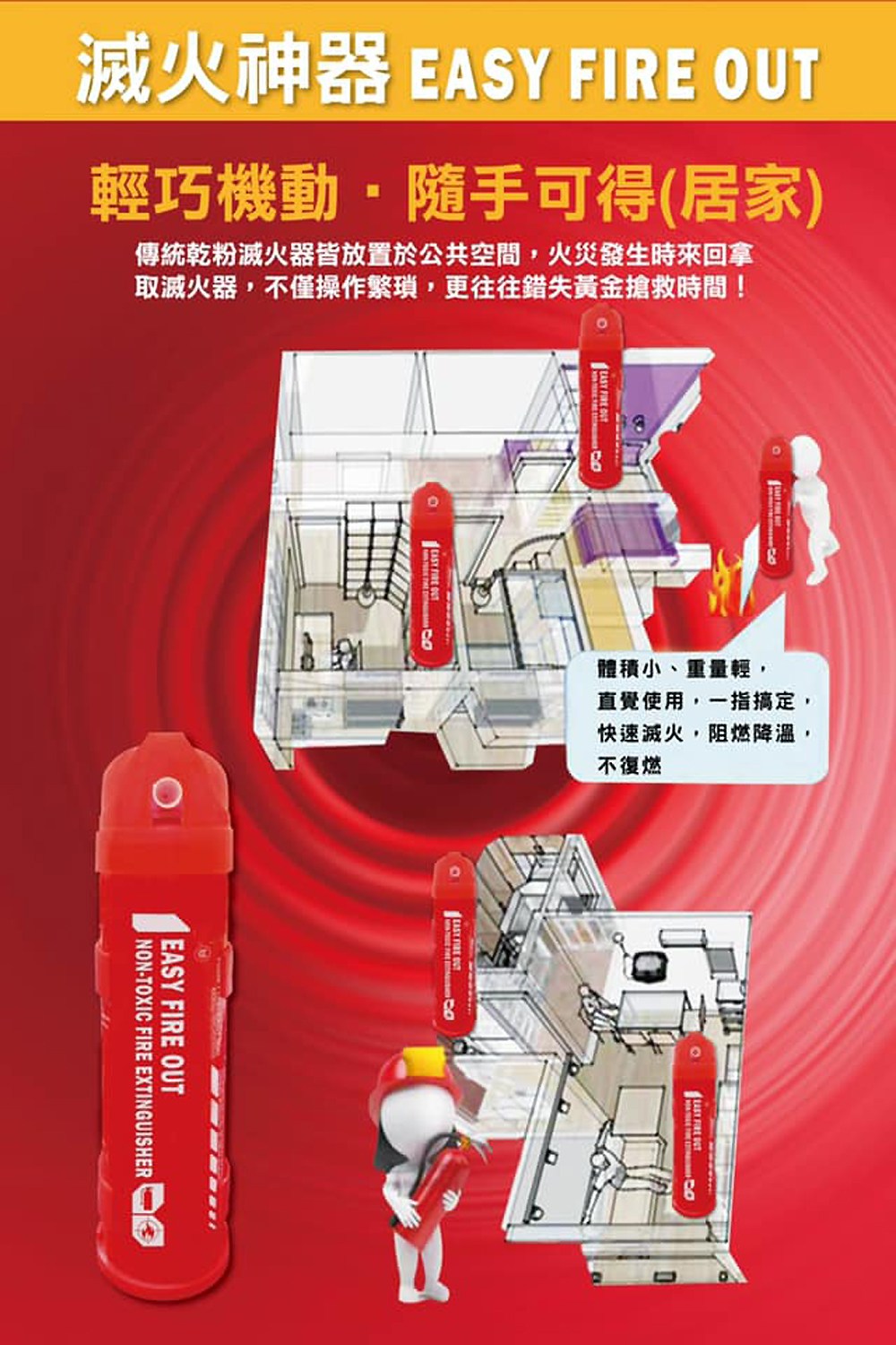 EASY FIRE OUT 滅火神器滅火器是一支全效型滅火器,是榮獲2012年台灣品牌玉山獎的專利產品,輕巧便利且體積小,可以撲滅油鍋/電器類或是多種家俱造成的火災。本產品百分之百台灣研發製造,