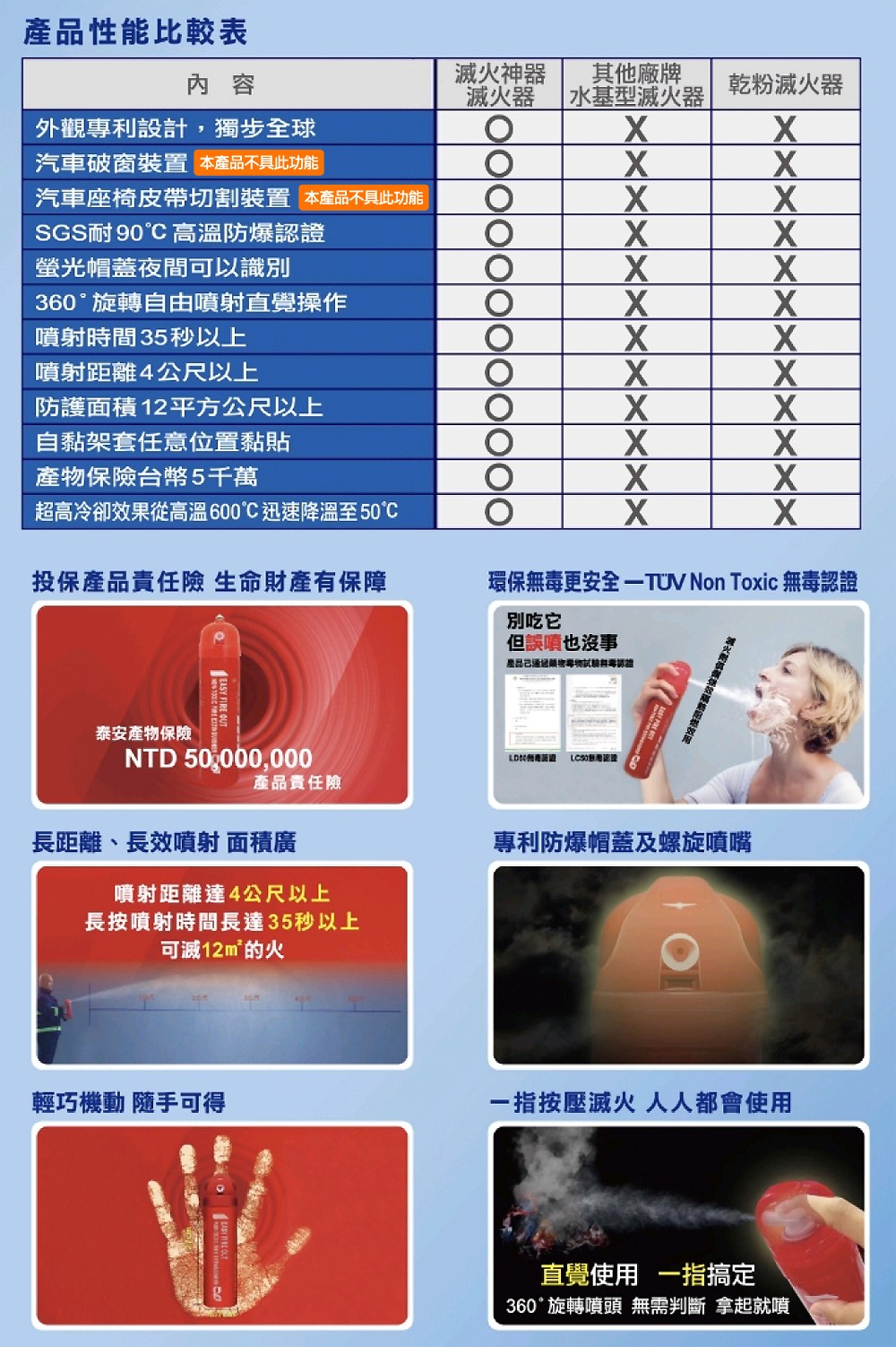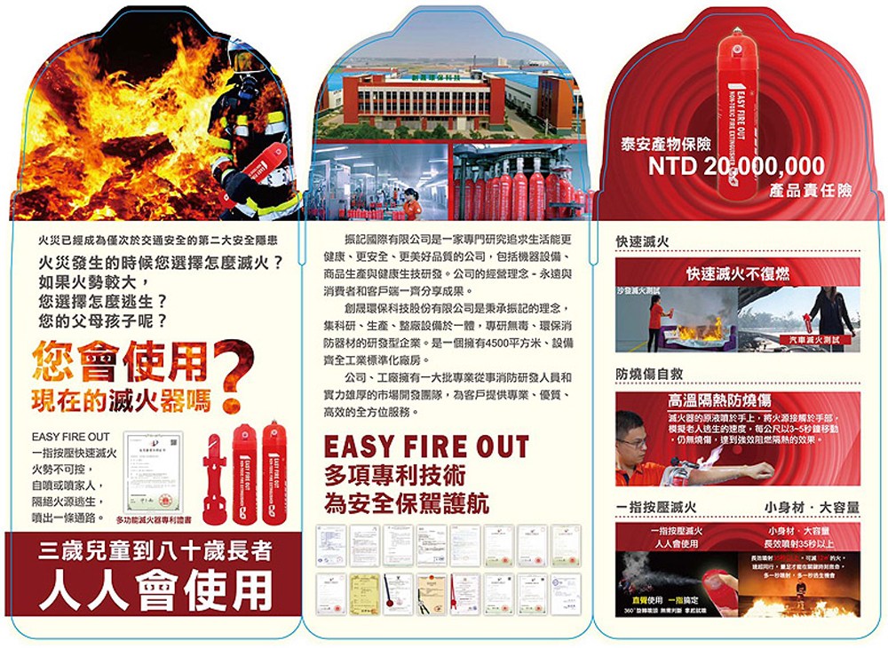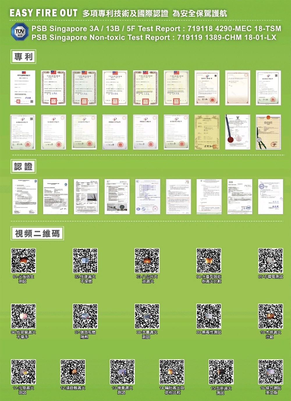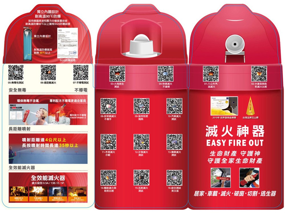 EASY FIRE OUT 滅火神器滅火器是一支全效型滅火器,是榮獲2012年台灣品牌玉山獎的專利產品,輕巧便利且體積小,可以撲滅油鍋/電器類或是多種家俱造成的火災。本產品百分之百台灣研發製造,