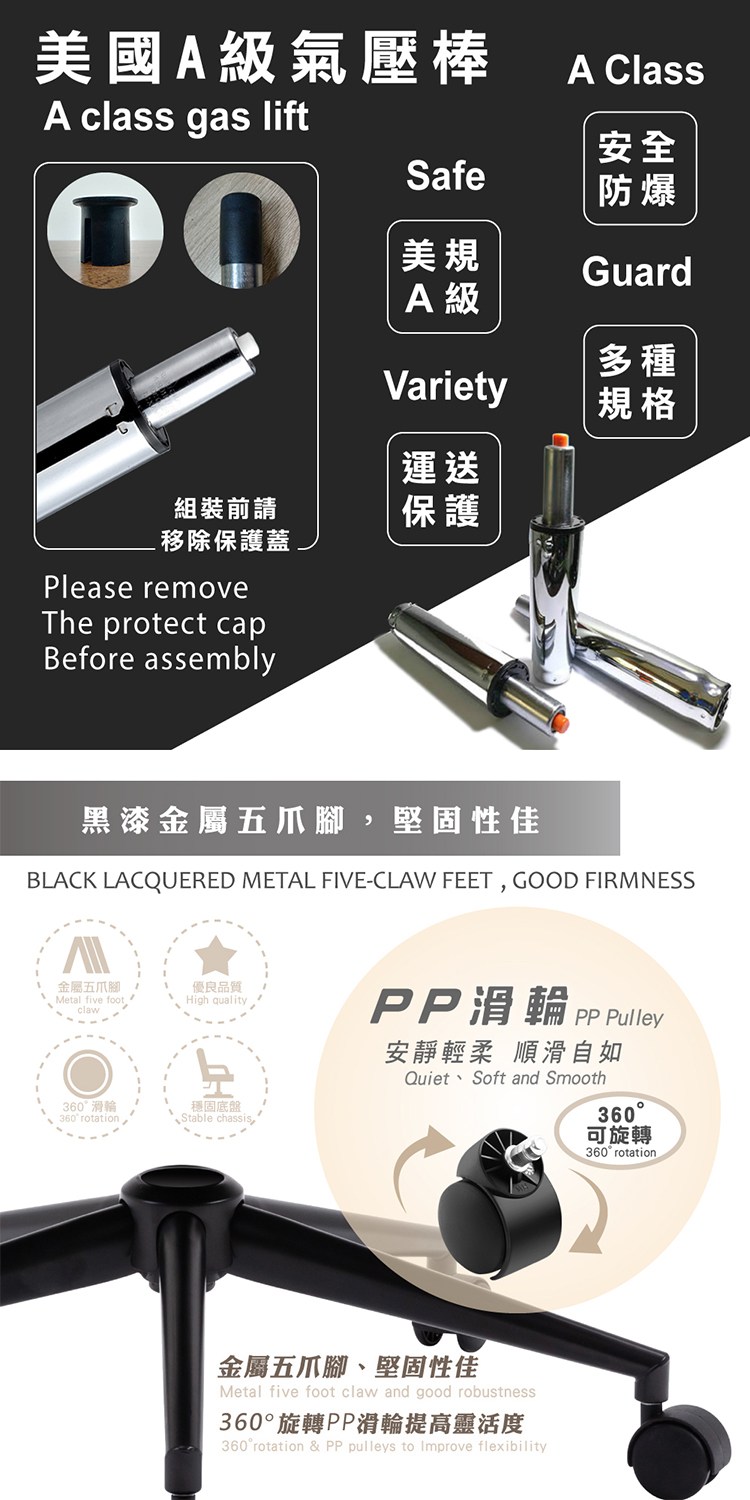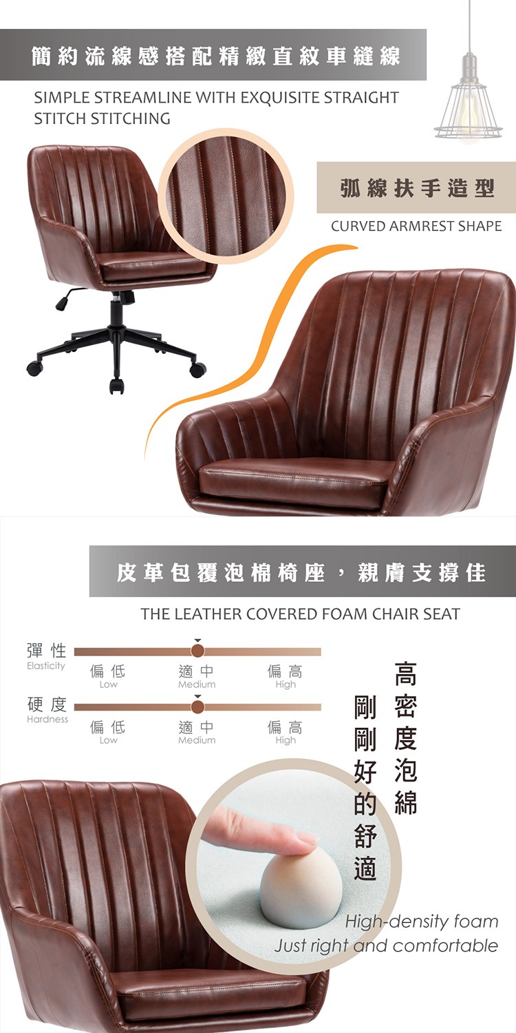 弧線扶手造型感強烈、休憩倚靠都舒適,配備美規A級氣壓棒可調高低,安全升降,提供出色的支撐與功能。