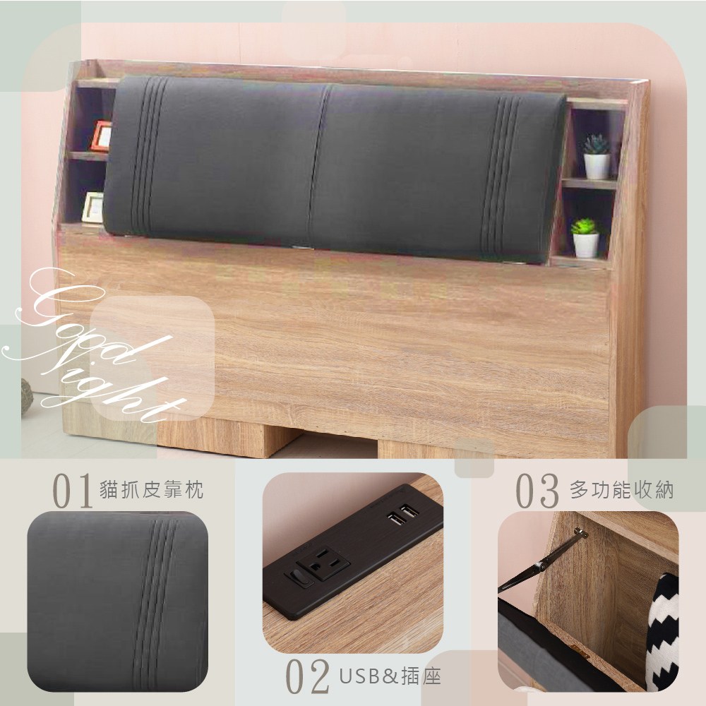 【KIKY】延禧貓抓皮附插座靠枕床組 雙人5尺(床頭片+高腳六分床底)