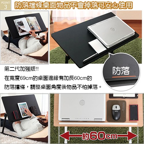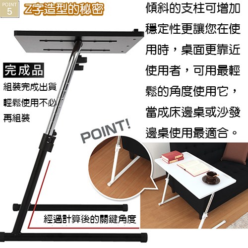 輕巧便利Z字桌集合《早餐桌》、《寫字桌》、《病床桌》、《遊戲桌》、《Notebook電腦桌》、《繪圖桌》、《沙發邊桌》、《化粧桌》的功能於一身,是日本暢銷的人氣王,您可利用它在沙發上享用早餐、補妝,或是隨您的需要,方便您隨處皆可使用Notebook。