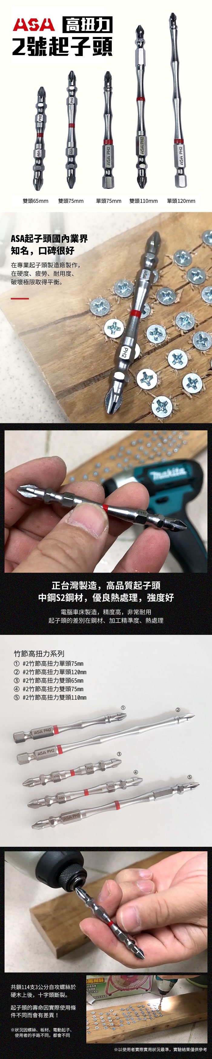 ASA 高扭力2號起子頭PH2 #2竹節雙頭65mm (10支組)雙頭65mm 10支