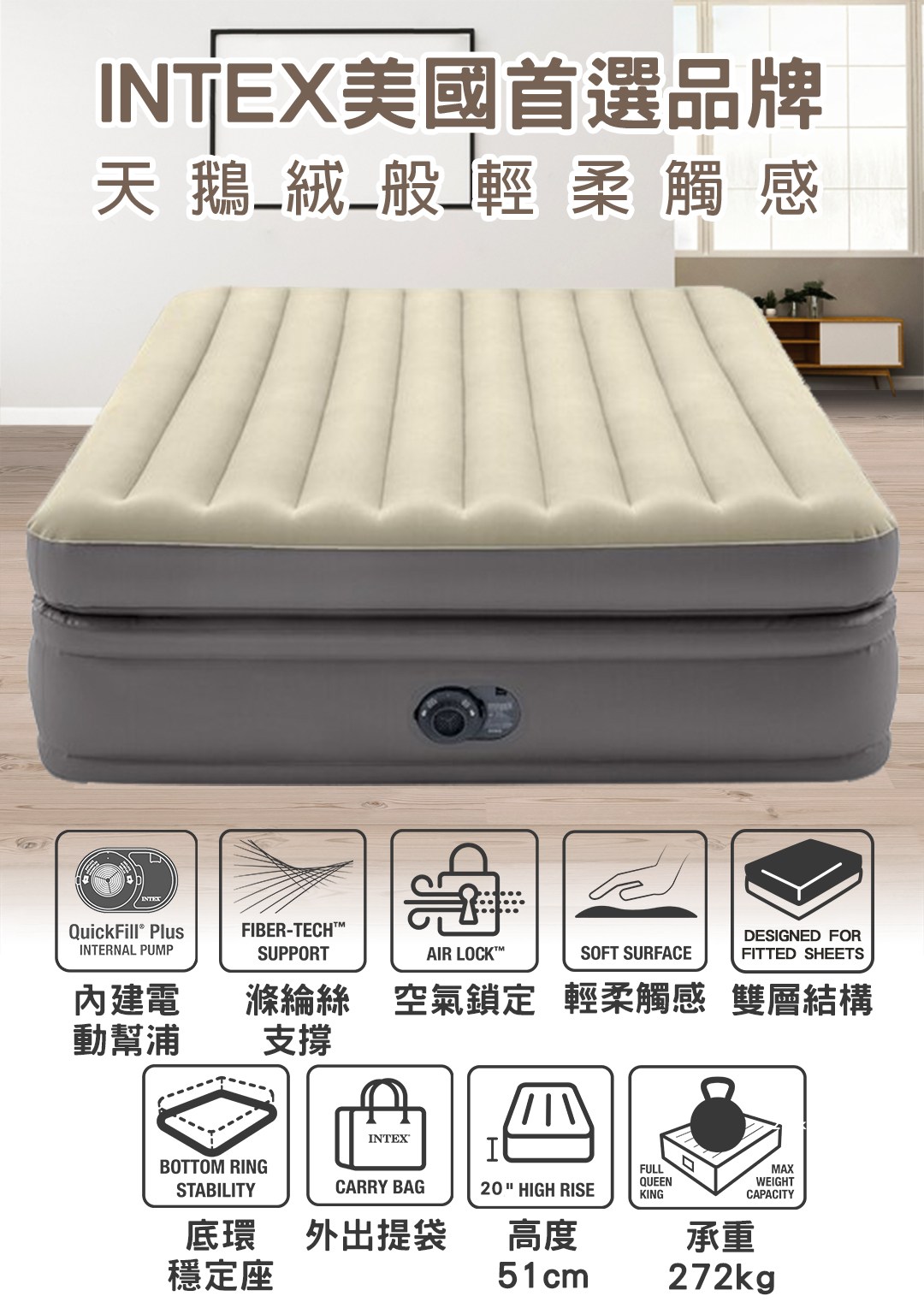 ◆ 內建電動幫浦(110-120V),可輕鬆快速充氣和放氣。