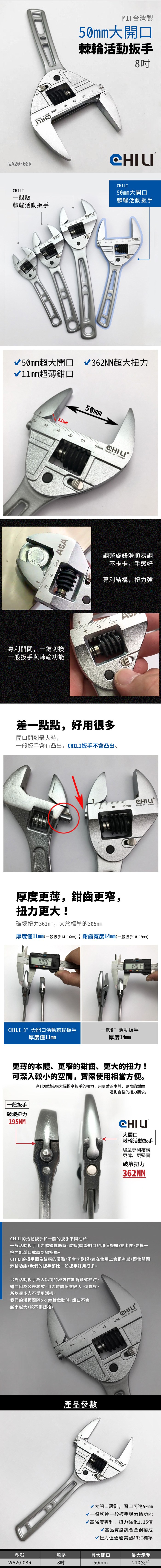 台灣製CHILI【50mm大開口棘輪活動扳手 8吋】WA20-08R 高扭力 超薄11mm 板手 扳手 大開口板手
