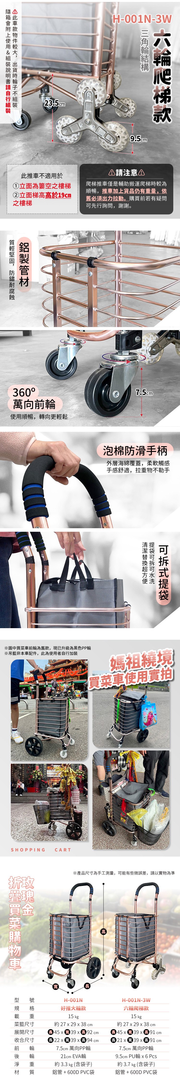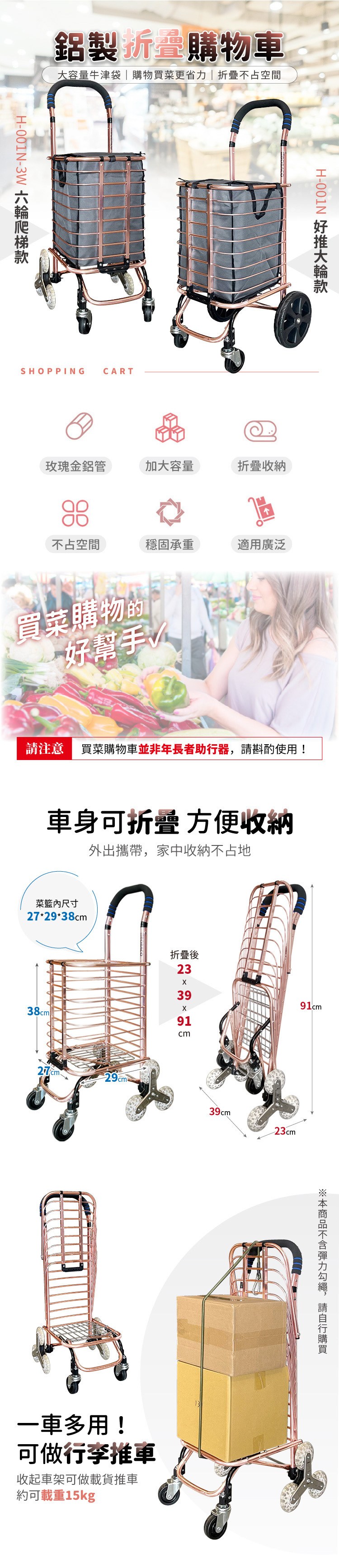 【大船回港】玫瑰金折疊買菜車-六輪爬梯款 (H-001N-3W)