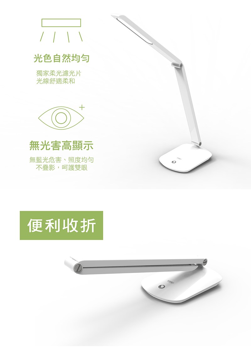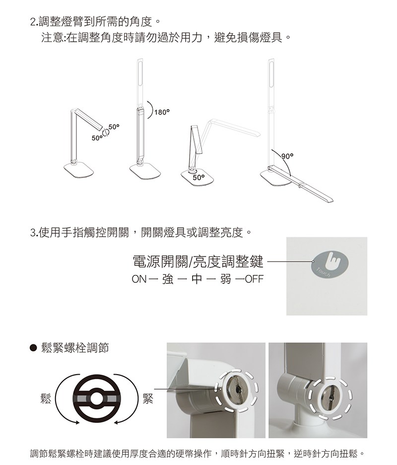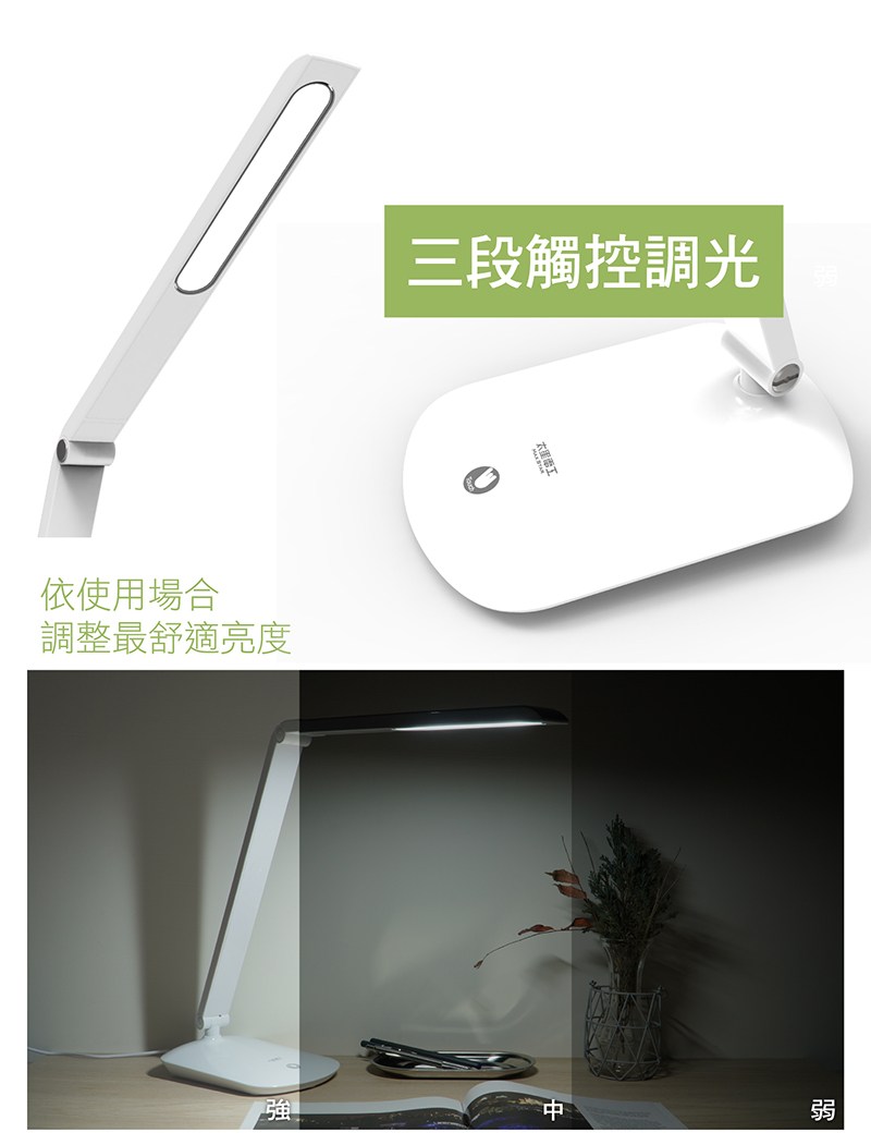 2.三段觸控調光:強光-中段-弱光,依使用場合,調整最舒適亮度。