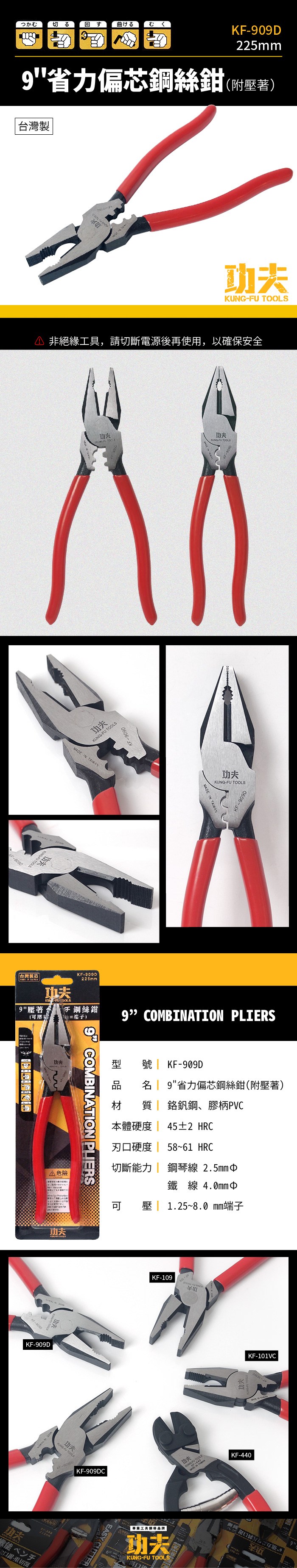 功夫 9"省力偏芯鋼絲鉗-附壓著225mm (KF-909D)