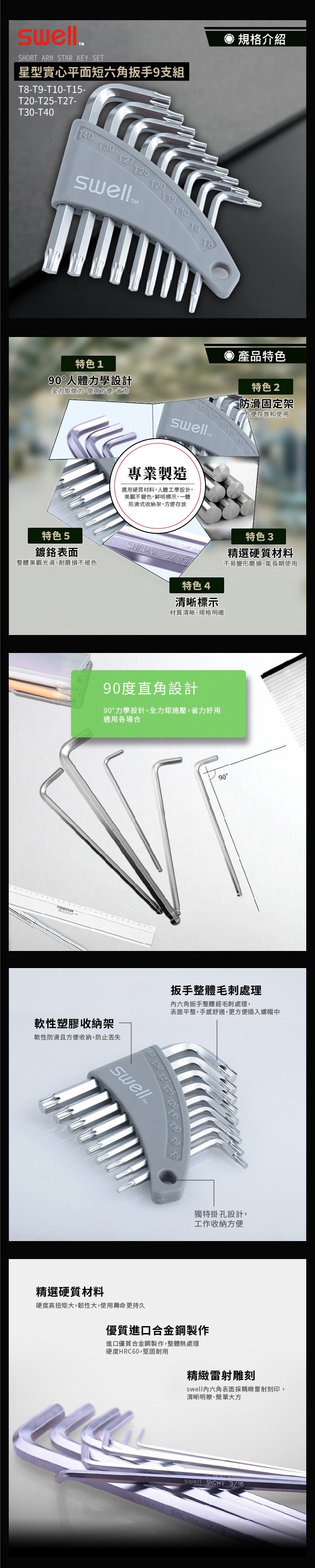 swell 星型實心平面 短六角扳手 9支組 T8-T40 1組